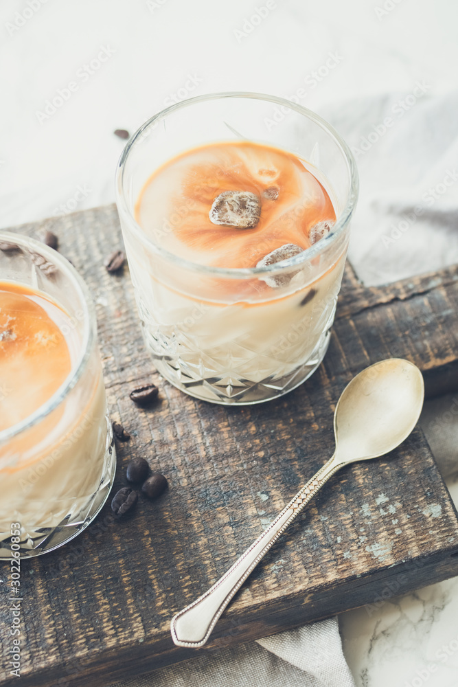 Coffee espresso ice cubes with milk in glass on white background with copy space. Your Coffee Ice Cubes Milk stock images are ready. Discover new arrivals in ice cube for coffee.